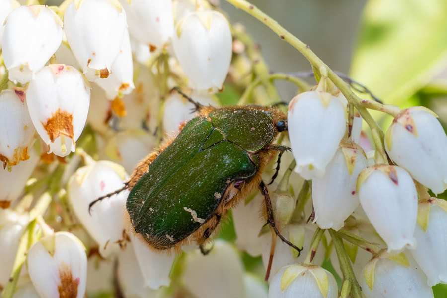アセビの花でナミハナムグリ、カイドウの花では枝で休むキイロスズメバチを見つけた。