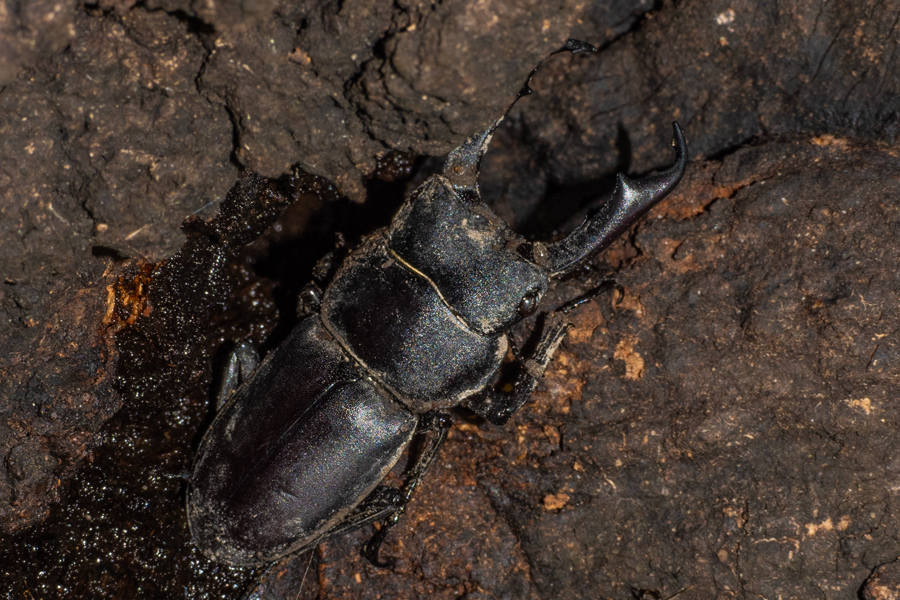 そして昨年3月に67mmのヒラタクワガタを見つけたクヌギに行ってみると、捲れの中にヒラタクワガタの姿が。取り出して大きさを測ってみると55mm、中型サイズだ。