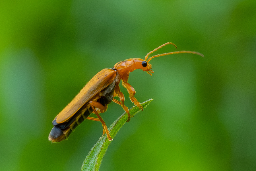 別ポイントに移動するため、車に戻ったところで、草の葉先にとまるセボシジョウカイを撮った。緑の背景に橙色の体が映える。