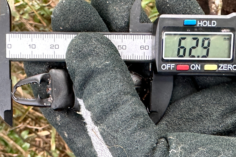 まずは昨年8月に64mmヒラタを見つけたノイバラトンネルのポイントに。あの時と同じように、A氏が木に登って洞で見つけたヒラタは63mm。オォッ! いきなり60mm超えだ。