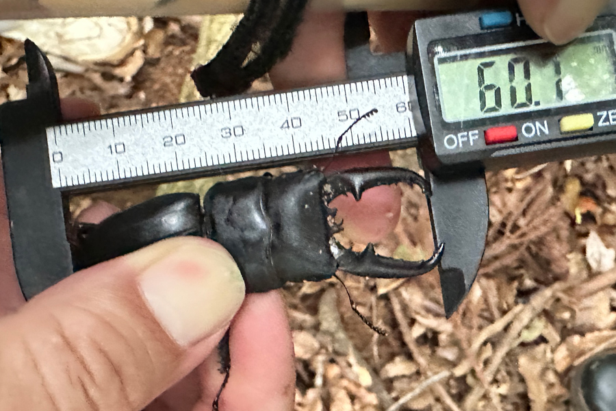 いたのは60mmのヒラタクワガタ。60mm超えが一応の目的なので、まずは達成だ。もちろん最終目的は70mm超え!。