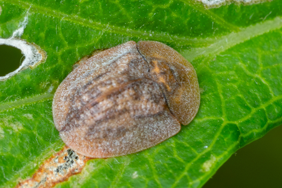 ヨモギの葉にはもう一匹丸い虫がいた。これはヒメジンガサハムシだと思う。