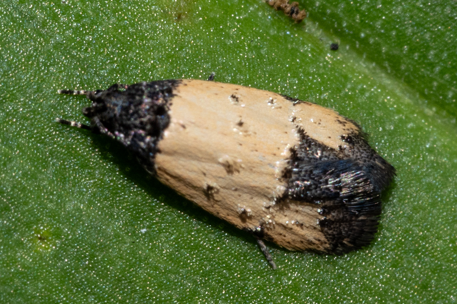 帰宅してさらに調べてみたところ、カレハチビマルハキバガという散策記初登場の蛾だった。
