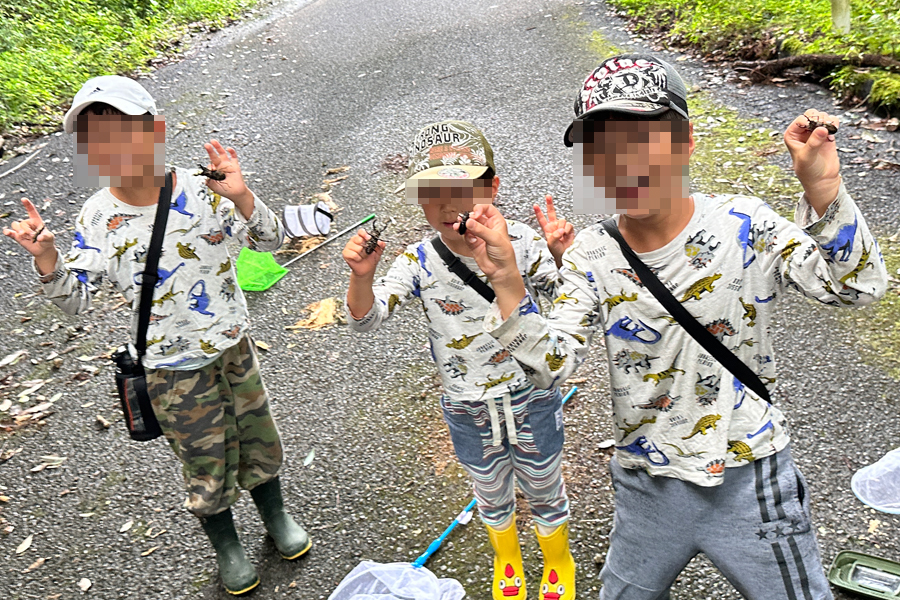長男くんが「ミヤマクワガタを捕ってみたい」と言うので、近場で過去に実績のあるポイントに行ってみた。数本あるクヌギを1本ずつ蹴ってみる。3本目を蹴った時にミヤマクワガタのメスが落ちてきた。長男くんは大喜びだ。そして端っこにある最後の木を蹴ってみると、ボトボトッと3匹のミヤマクワガタのオスが落ちてきた。子どもたちは大興奮で歓声をあげながら小躍りしている。