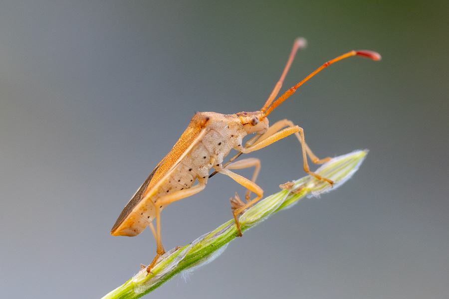 地味な色であまり大きくもく、しかも極めて普通種ということで、なかなか撮影意欲がわかないカメムシだが、赤くて長めの触覚がカッコイイ。