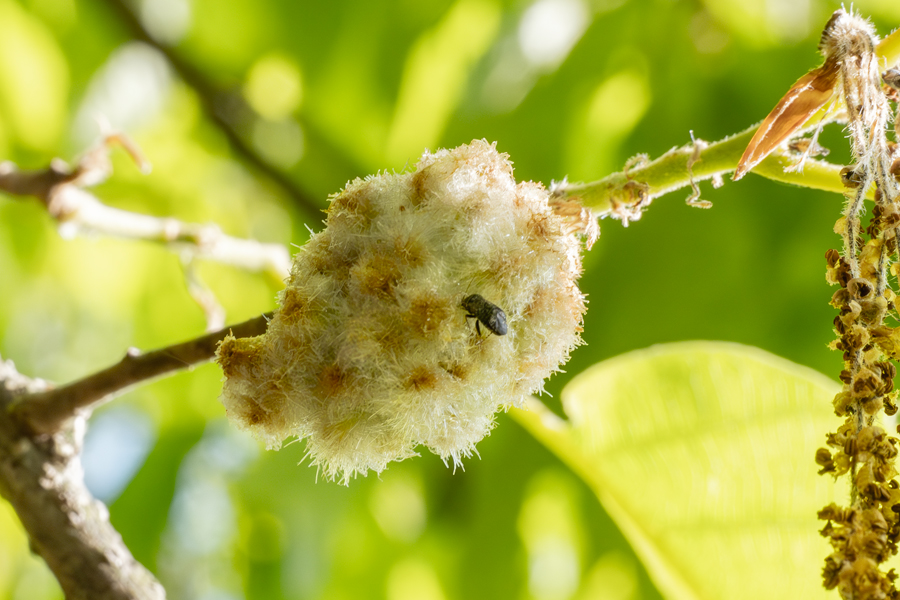 帰宅した夕方、自宅裏のクヌギ林を歩いてみる。クワガタは見つからなかったが、クヌギの枝に白っぽい塊を見つけた。これはクヌギハナカイメンフシという「虫こぶ」と呼ばれるもので、クヌギハナワタタマバチという小さなハチに産卵されて異常成長したものだ。この中に幼虫がいるそうだ。