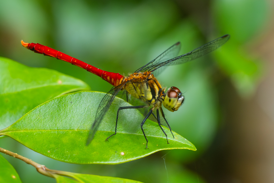 結局このポイントでは大物が見つからず、トボトボと山道を歩いていると、マユタテアカネが近くの葉にとまった。腹部が綺麗に赤く染まっていた。