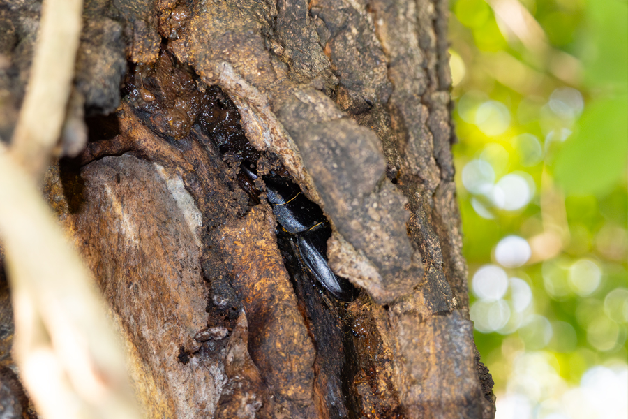 しかし、これだけ樹液が出ていても、クワガタはいない。いたのはケシキスイくらだった。その隣にある木のメクレには55mmの中型ヒラタがいた。頭部の穴や大アゴの傷など、夏場に他のクワガタと過酷な争いをしてきたのだろう。