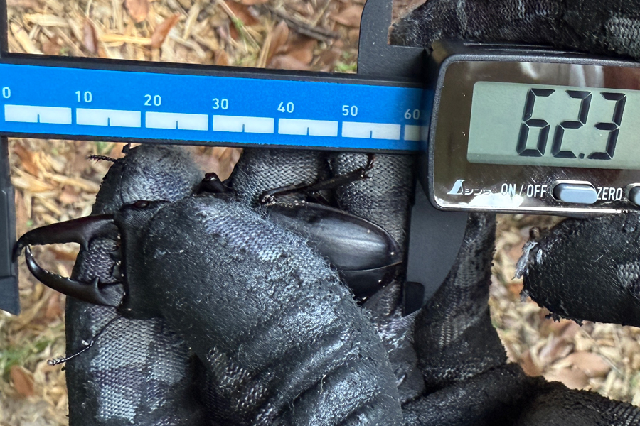 さらに近くにある細いクヌギも一応見ておくか、という感じで見てみると、ヒラタクワガタが3匹。そのうちT氏が見つけたものは62mmあった。