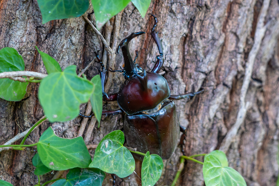 藪漕ぎをしてたどり着いた目的の木は、期待通り樹液がダラダラだったが、いたのは54mmのヒラタクワガタとスズメバチ。そして近くの木には立派なカブトムシもいた。胸部に空いている穴は、クワガタと戦った時についたものだろうか。