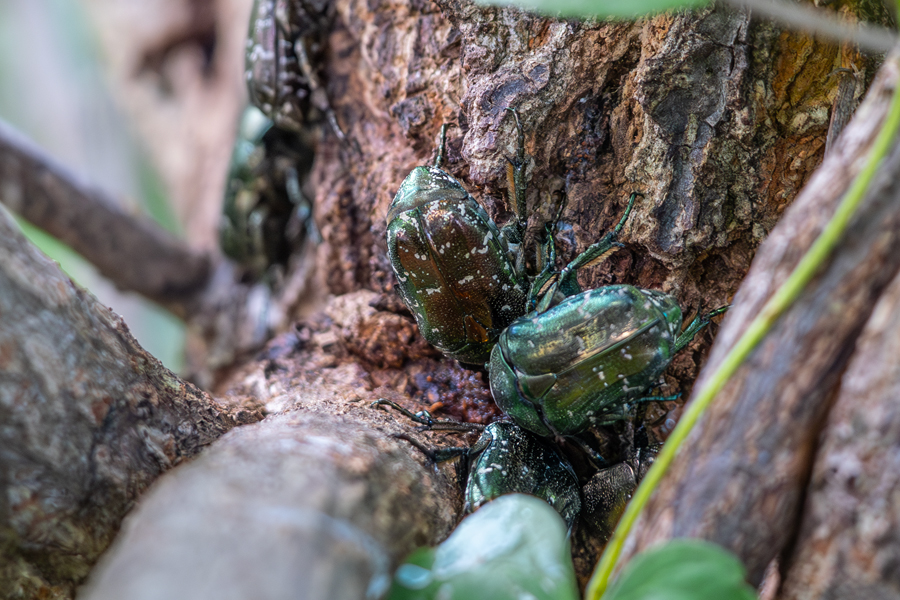 海の近くのポイントに到着し、草が生い茂った道を歩いて進む。途中にある小さなクヌギにはシロテンハナムグリが群れていた。