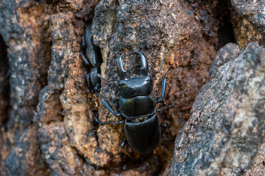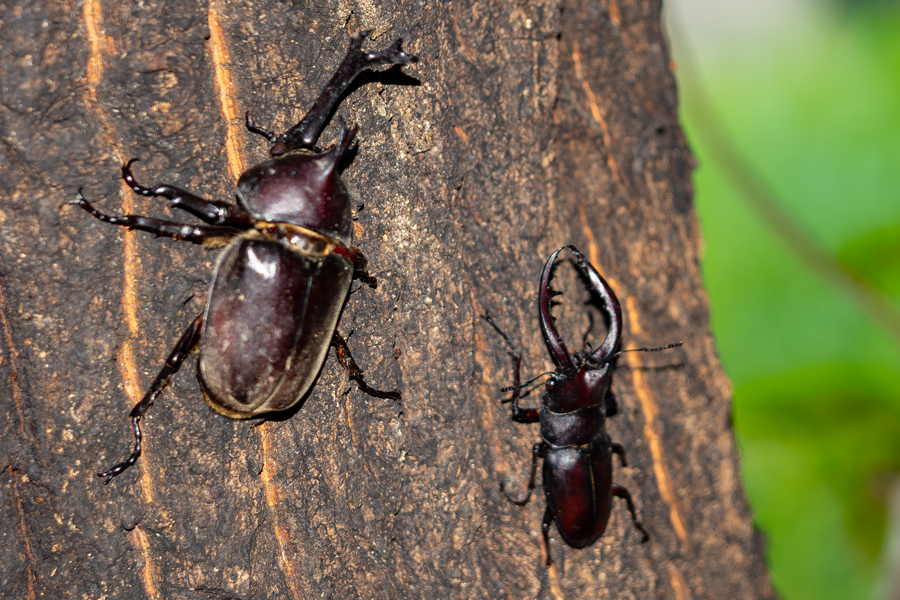 ついでに確認した細いクヌギでは、小型のヒラタクワガタのペア。