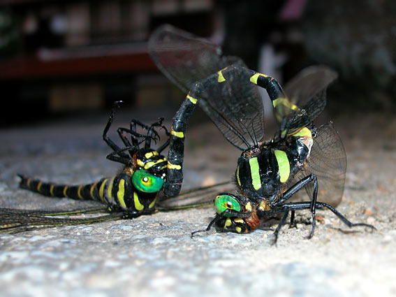 - 庭を歩いていると、突然オニヤンマの夫婦が落ちてきた。 右側がオス、左側がメスだ。 いわゆる“連結”という状態で、実はこれはまだ交尾の準備段階だ。 ご覧のようにオスがお尻の先で、メスの首根っこをつかまえ、この状態のまましばらく飛行する。 デートのようなものだ。 そして落ち着いて交尾できそうな場所を見つけ、そこでゆっくりと交尾するわけだ。 ここまでは人間とあまり違いはないのだが、トンボの凄いのはここから。 オスはメスの首根っこをつかまえたままで、メスの方がグッと長い腹を丸めて、生殖器である先端をオスの腹のつけ根あたりに結合する。 そこにはオスの副生殖器があり、オスはあらかじめ自分の腹を折り曲げて副生殖器に精子を貯めておくのだ。 何故そんな面倒臭いことを、と思うのだが、そこには私の知らない進化のプロセスがあるのだろう。