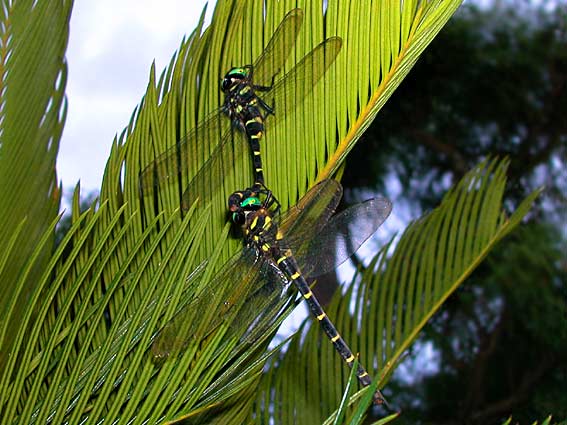 - で、どうしてこのオニヤンマ達は地面に落ちてきたのか疑問に思った。 最初は、台風の影響による強風のためかな、と思ったのだが、よく見るとメスの後羽が半分ない。 それでバランスを崩したのではないかと想像する。 この画像では分かりにくいので、この後飛び立って側のソテツの葉にとまった画像をこちらに置いているので、メスの後羽を見ることができる。