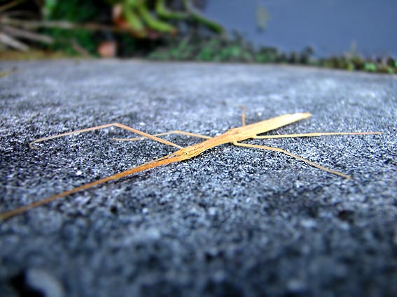 散策途中の田んぼ沿いの用水路のコンクリート壁に、薄黄色のナナフシがいた。 今まで出会ってきたエダナナフシやナナフシモドキ達の、緑色や褐色の体とは全く違う色合いだ。 帰宅後に図鑑をめくってみると、タイワントビナナフシという種の色味がよく似ている。 もしもそうなら羽があるはずなんだが、なにしろ高さ1.5mくらいの用水路で、左手には愛犬の鎖を持っての片手撮りだ。 じっくりと観察することができなかったので決め手に欠ける。