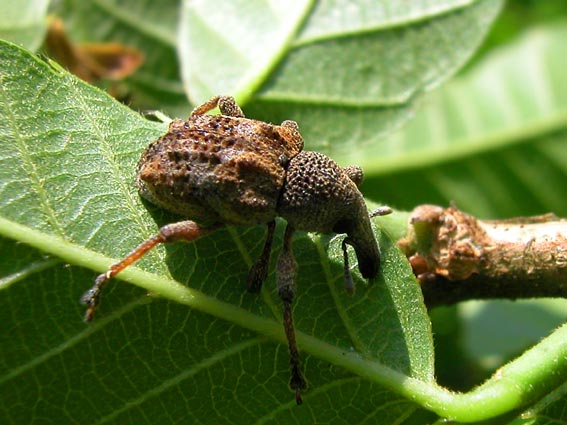 仕事前に、娘と裏山に散歩に出掛けた。 林縁のクヌギの葉裏にいたゾウムシを見つけるが、見慣れないゾウムシだ。 背中(上翅)は茶褐色のマダラ模様で、ゴツゴツとしたコブがある。 胸の部分は細かい凸凹があり、まるでドングリの殻斗のようだ。 図鑑と睨めっこしたところ、雰囲気的にアカコブコブゾウムシという、コブコブした名前のゾウムシのようだ。