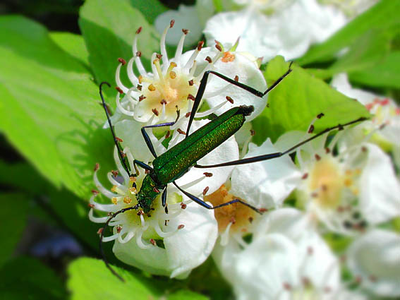 初夏に各種の花に見られる美しいカミキリムシ。 体はとても細く、後足が極端に長いのが特徴。 幼虫はトドマツやクリなどの伐採枝によくいる。