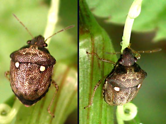 背中に黄白色の丸い紋があり、全体に丸っこい(正六角形に近い)形のカメムシ。 イネ科植物の穂などによく集まるらしい。